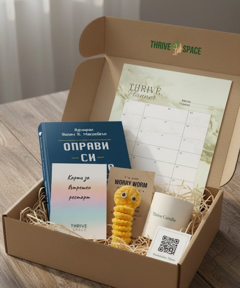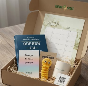 Всяка кутия съдържа внимателно подбрани инструменти, които съчетават грижа, структура и вдъхновение, за да ти помогнат да се върнеш към себе си и да работиш без бърнаут.
